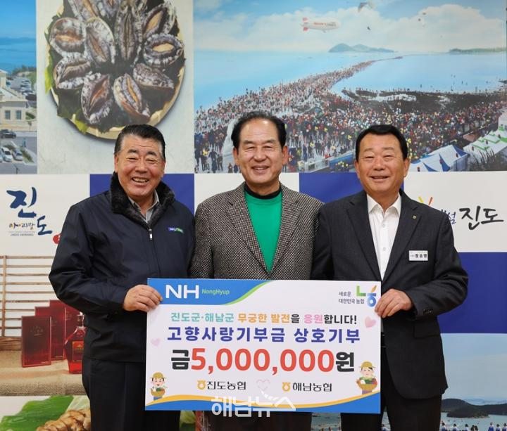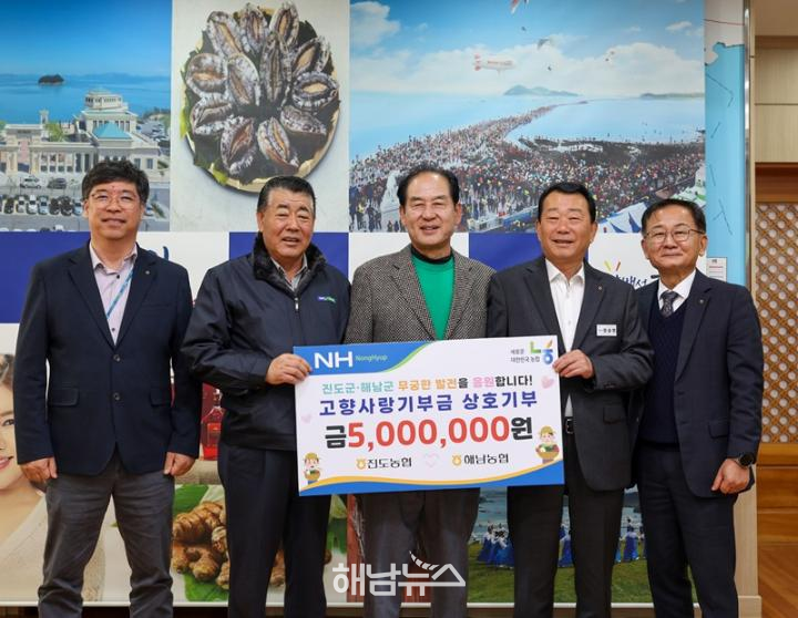진도농협은 지난해 해남미남축제 기간 해남군에 500만 원의 고향사랑기부금을 전달한 데 이어, 이번에는 해남농협이 진도군에 500만 원을 기부하며 따뜻한 마음을 되돌려 주었다.