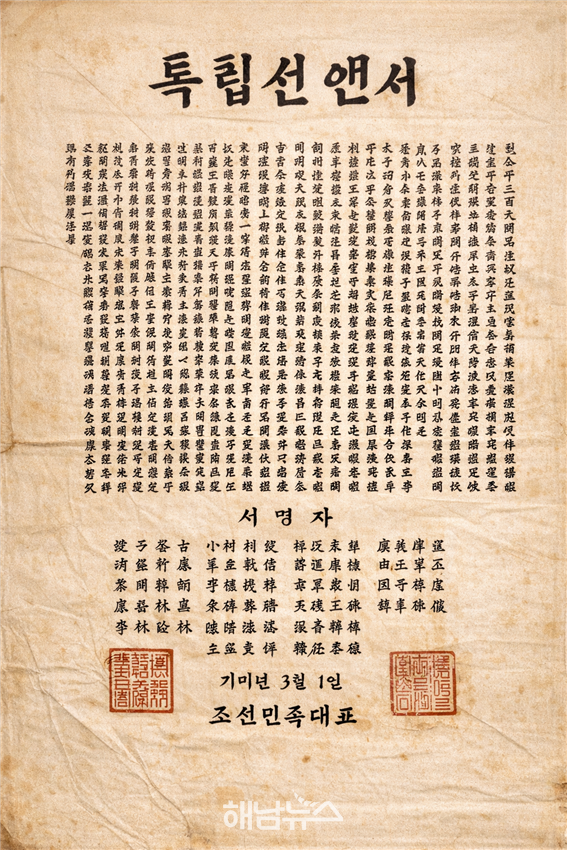 ![]() 대한독립선언문 원본 / 사진제공=호남뉴스 |