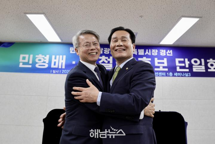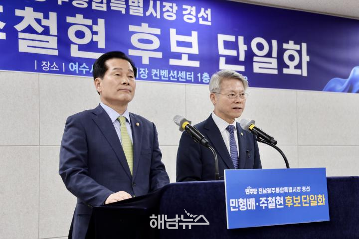 더불어민주당 경선 후보인 민형배 국회의원(광주 광산구을)과 주철현 국회의원(전남 여수갑)이 1일 전격 단일화를 선언하며, 단순한 후보 결합을 넘어 ‘가치와 정책의 통합’이라는 새로운 정치 실험에 돌입했다.